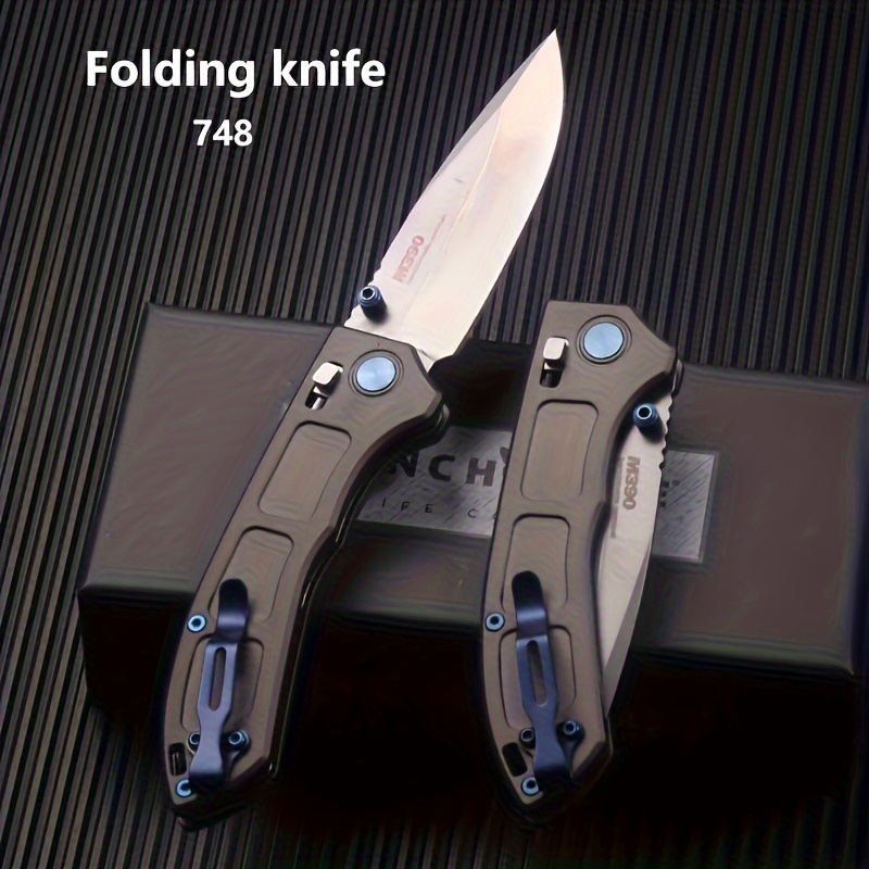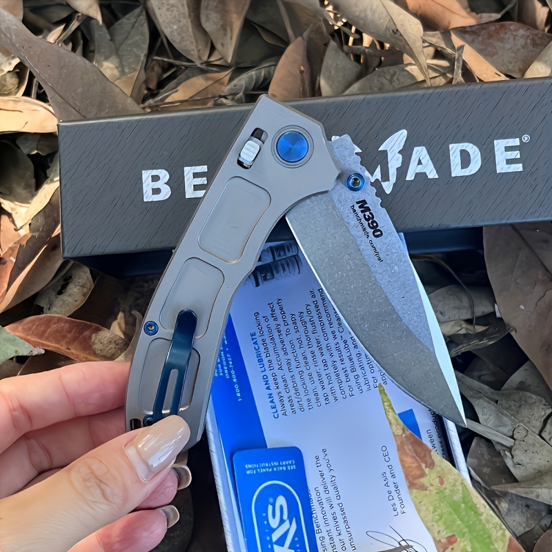 The BM748 features a 3.43" blade crafted from premium M390 steel, known for superior corrosion resistance and edge retention. Its handle is made of lightweight, durable gray titanium alloy, combining strength with comfort for outdoor use as a reliable outdoor survival gear piece.