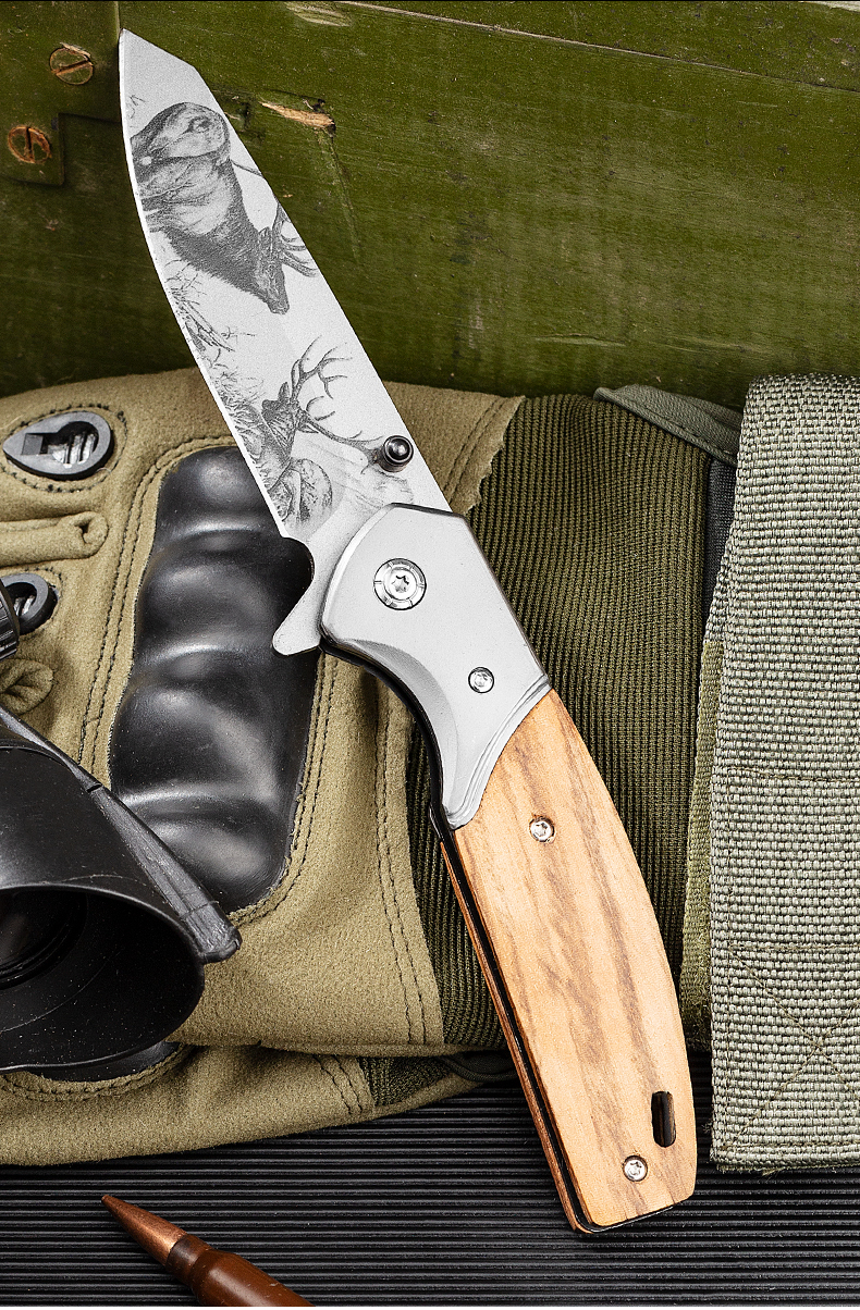 The Elk Tactical Folding Knife is a reliable EDC folding knife crafted for outdoor knife users and hunters alike. With a wooden handle, stainless steel blade, and secure folding design, it's a trusted choice for anyone seeking the best hunting knife for daily carry.
