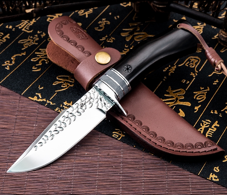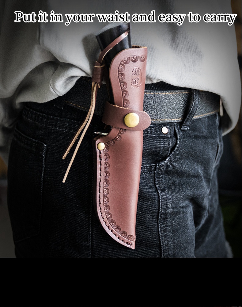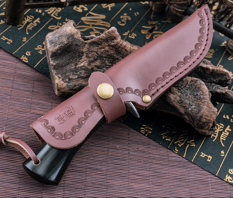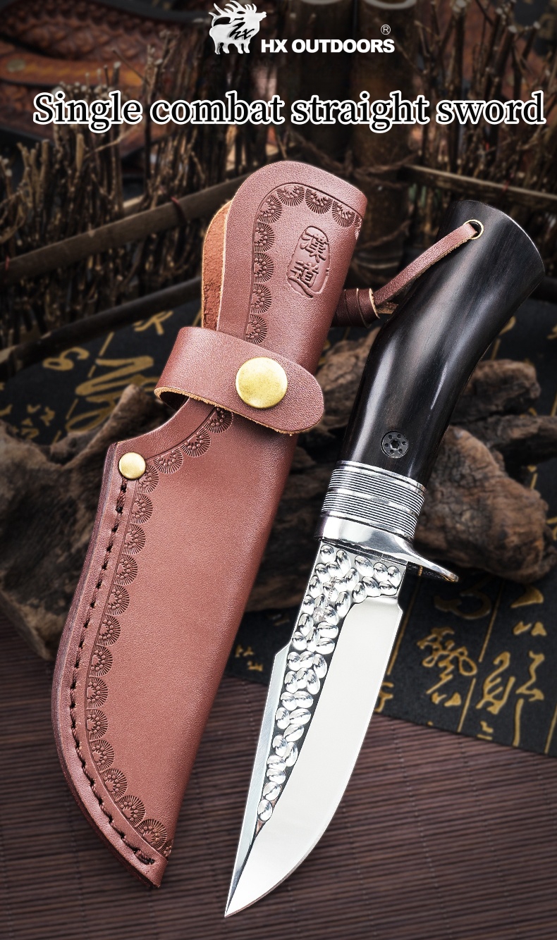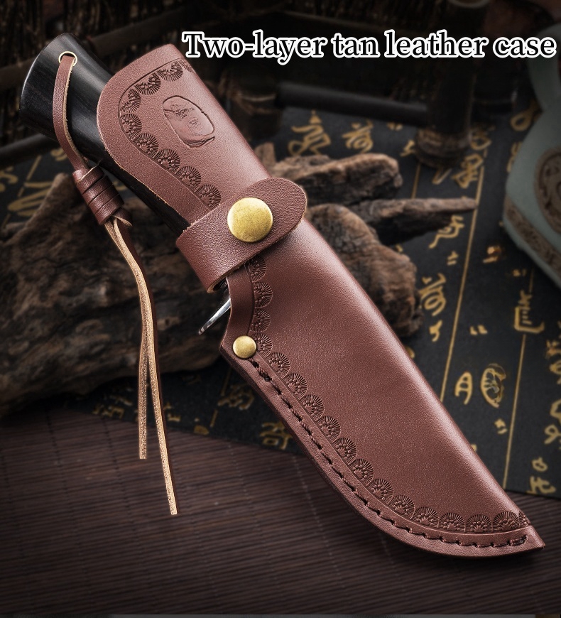 1PC HX OUTDOORS Straight Knife, EDC Multi-function Outdoor Exploration Tool Knife, Pocket Knife With Cowhide Knife Cover, 7CR17MOV High Hardness Stainless Steel Blade, Ebony Handle, CNC Fine Grinding Process, Top Quality, The Best Choice For Gifts